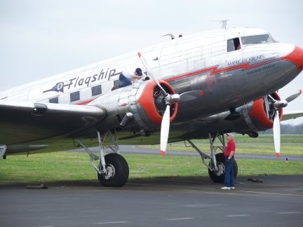 We are on target this AM, get to the show and get our table set up outside while others are cleaning the plane. We are positioned next to the fence separating the airplane parking area from the runway, with our right wing actually hanging over a good bit. And right there opposite our table is a loud speaker. Great! We ascertain that we have wire cutters on board should the situation become unbearable. Then we head off to a great breakfast catered by Waffle House where we meet lots of nice folks, especially the crew of the old Berlin Airlift DC-4 parked next to us. The interior of their plane is fixed up like a museum. We ask them how they make money since they do not do rides and they say they are from New Jersey and so it is not a problem (Mafia). Of course, it is obvious what crew we (and everyone else is) as we are all wearing our identifying T-shirts except Zane and Peggy who are dressed in their vintage look pilot and stewardess gear.